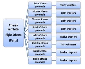 "Sthana" means a collection of different chapters focused on the same subject. There are eight sthana (parts) in Charak Samhita.
