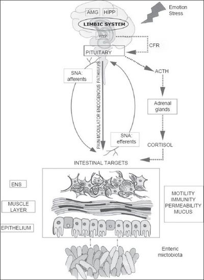 Gut-Brain axis has bidirectional communication between central and enteric nervous system. It connects emotional and cognitive centers of brain to peripheral intestinal functions. By means of neural, endocrine, immune, and humoral links gut microbiota interact with GBA axis .[40]Marilia Carabotti et al in there review article have explored these interactions, as well as the possible pathophysiological mechanisms involved. Microbiota-gut-brain axis monitors and integrates gut functions and links emotional and cognitive centers of the brain with peripheral intestinal functions. This complex network includes central nervous system (CNS), the autonomic nervous system (ANS), the enteric nervous system (ENS) and the hypothalamic pituitary adrenal (HPA) axis. Central nervous system communicates with enteric nervous system (ENS), intestinal muscle layers and gut mucosa through various afferent and efferent autonomic pathways. Gastrointestinal wall connect with CNS through enteric, spinal and vagal efferent pathways. Limbic system which includes Amygdala (AMG), hippocampus (HIPP), and hypothalamus (HYP): predominantly responsible for memory and emotional responses. Hypothalamic pituitary adrenal (HPA) axis which is a part of limbic system activates in response to emotional stress and releases corticotropin-releasing factor (CRF) from the hypothalamus. CRF further stimulates adrenocorticotropic hormone (ACTH) secretion from the pituitary gland, causing the secretion of cortisol (main Stress hormone) from the adrenal glands. This hormone affects brain functions. Brain through neural communication influences various intestinal cell targets. The Gut microbiota also influences these same cells. Gut microbiota interact locally with intestinal cells and enteric nervous system (ENS), it also connect with central nervous system (CNS) through neuroendocrine and metabolic pathways.[41]