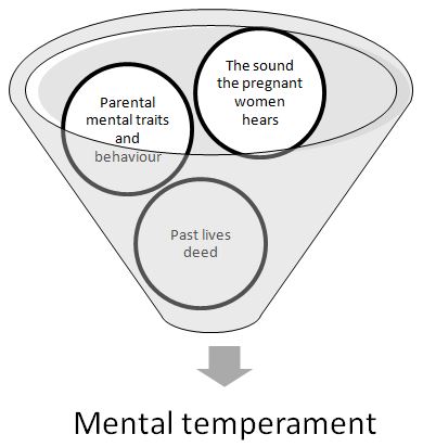 Prakriti is formed during conception by union of sperm (shukra) and ovum (shonita) with consciousness elements (atmavikara).[Su.Sa. Sharira Sthana 4/63][2] Manasa prakriti is formed at the same moment by combination of three primary attributes (trigunatmaka)(Code: SAT-A.126).[3]This forms the fundamental structure of psychological constitution. The hereditary components, social surroundings, personal factors like diet, experiences, and cultural background determine the development of psychological constitution further.