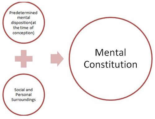 The psychological constitution is also known as mental disposition, mental temperament, mental constitution, personality, mental trait and psychological rhythm. Manasika prakriti denotes mind's design, psychological makeup of an individual,[1] totality of an individual's reactions and interactions with others, influencing factors behind personal morals, perceptions, values, and attitudes.