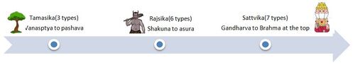 The three types are classified further into sixteen subtypes based on the development of perfection from the point of darkness. [Cha.Sa.Sharira sthana 4/37-39][Su.Sa.Sharira Sthana 4/81-97][2] Kashyapa added two more to bring the total to eighteen. [Ka.Sa.Sutra Sthana 28/8-31][4] Individuals are placed into one of these groups depending on their psychological development, which is arranged in a highly methodical sequence (order of development from tama to sattva). Individuals categorized under brahma kaya (traits of supreme God Brahma) have the highest level of mental characteristics. Individuals with vanaspatya (traits of vegetable life), which is at the bottom of the list of development phases have a lower level of mental faculties. This systemic pattern depicts the evolution process from vanasptya to brahma, demonstrating the inclination in terms of mental traits. Here, the first three prakriti classifications are further subdivided into subtypes based on variants arising from the natural interaction of the traits of each core group. Most of the subtypes have some common features with the upper one and lower one subtype which shows the possibility of inclination from one stage to another in terms of psychological development. This nomenclature is primarily based on the systematic development of psychological faculties.[5]