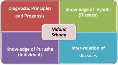 The section Nidana Sthana deals with principles of diagnosis of diseases. The term Nidana is applied for knowing the origin of disease (vyadhijanaka) and comprehensive information of disease (vyadhibodhaka). [Chakrapani on Cha.Sa.Nidana Sthana 1/1-2]