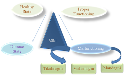 The relation between agni and disease process is essential to be understood. Impairment of agni is a cause of accumulation of various toxic products inside body leading to disease. Agni includes all processes of digestion and metabolism taking at gross level, tissue level, micro-cellular level. Hence it needs a special emphasis while treating a disease. Diagnosis of agni of a person is one of key factor in understanding disease.