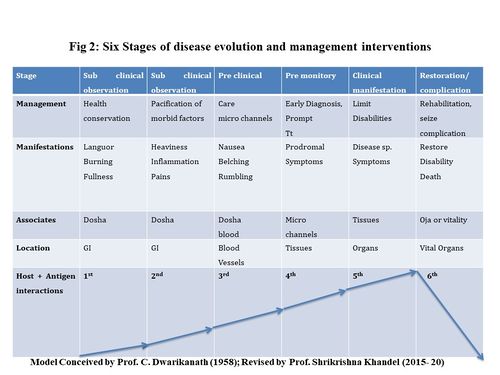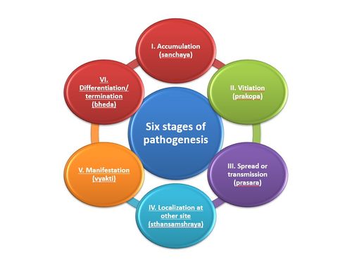 More than 30 centuries ago, Sushruta - the father of Surgery in his compendium Sushruta Samhita has given the concept of shatkriyakala (six stages of disease evolution for treatment interventions). In this compendium, after careful study of the inflammatory process in open wounds (vrana)[1], he conceptualized the natural history of disease evolution. The concept of kriyakala (stage of treatment intervention or strategy) describes the mode and stages of the development of the disease. There are six distinct formative patterns or stages of manifestation of diseases. Each stage has its own characteristic symptoms to enable a treating physician to recognize the disturbance at the early formative stage of the disease.
