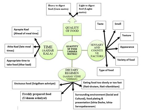 This chapter describes the principles of food and dietary intake for healthy living with special emphasis on the quantum of food ingested. It is advised that one must eat in accordance with the capacity of one’s stomach and the quantity of food is determined by the strength of one’s digestion capacity (agni). Ayurveda regards ama, or undigested food, as the cause of vitiation of dosha and consequently various disorders. Proper quantity of food is digested in time without disturbing one’s health. Diet taken with proper consideration of agni positively promotes one’s strength, complexion, health and life, while improper quantity (amatra) of food - less (heena) or excess (adhika) - leads to various disorders. The chapter mentions various aspects of satiety and its physioloigcal mechanisms.