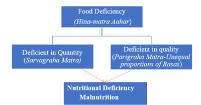 Inappropriate quantity is of two types - deficient or excessive in quantity – as briefly mentioned earlier. The food taken in deficient quantity is said to be the cause of reduction in strength, complexion and nourishment of body tissues, non–satisfaction, altered peristalsis and misplacement of vayu, impairments in life-functions, quality of body tissues (saara), sexual stamina (virility) and ojas (vitality), damage to the body, mind, intellect, and sense organs, inducing inauspiciousness and also making the person home to a variety of disorders of vata.