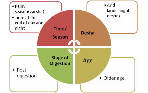 Vata is categorized as ‘dosha’ primarily because of its capability to vitiate other body components. It is also mentioned as ‘dhatu’ because in normal state, it sustains or maintains the body.[3] [Su.Sa.Sutra Sthana 21/4]It is also called as ‘mala’ as it can make the body unwholesome and produced as waste material during the process of digestion “katu avasthapaka”(last stage of digestion). [Cha. Sa. Chikitsa Sthana 15/11] Vata is the somatic factor having two prime functions –movements (cheshta) and process of learning or knowledge (jnana). Vata is swayambhu (self-existent) and it is the root cause of production, preservation, and destruction.[Su.Sa.Nidana Sthana 1/7][3] Vata is the controller of body. Vata leads the functions of all dosha, and its responsible for many diseases.[Su. Sa. Nidana Sthana 1/8][3]