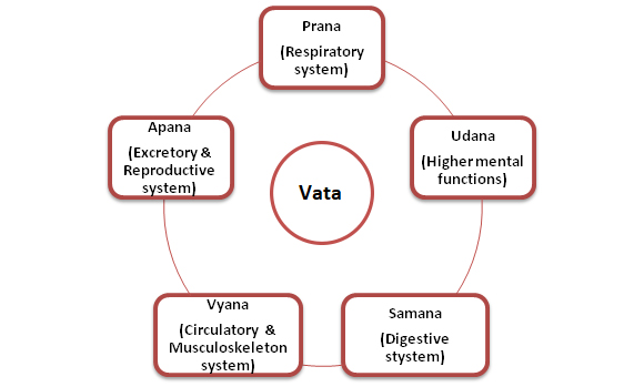 Prana, Udana, Samana, Vyana, and Apana are the five classifications of vatadosha. Five sets of functions by which vatadosha is divided into five types are described with [Su.Sa. Sutra Sthana 15/4][3] the diseasespecificity of five types of vata.[Su.Sa. NidanaSthana 1/13-19][3]The location and function of five types of vatadosha based on different Ayurvedic texts are as given in table 1. [Cha.Sa. ChikitsaSthana28/5-11]