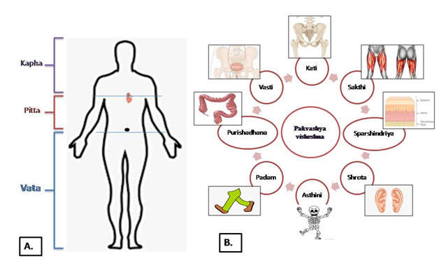 Dosha pervades every part of the body. [Cha.Sa. Sutra Sthana 20/9] Acharya stated the general location of vata, pitta and kapha are the lower, middle, and upper portions of the body, respectively marked by the heart (hridaya) and umbilicus (nabhi). [A.S. Sutra Sthana 1/4] Vata is predominately present in body parts below umbilicus (adho nabhi). [K.S. Sutra Sthana 27/10][10] The specific sites of dosha are locations where their functions are primarily observable. The specific seats of vata are: